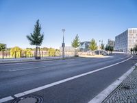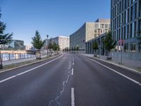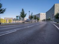 The cityscape of Berlin, Germany, with its modern architecture, cobblestone roads, streetlights, and trees, is a bustling urban neighborhood with a clear sky above.