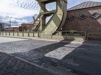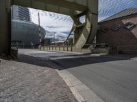 A road lined with classic brick architecture and modern composite material buildings in the city of Bremen, Germany. A bridge connects the European harbor of Bremerhafen with the metropolitan area, where clear skies, tar roads, and vegetation create a vibrant urban design.