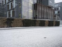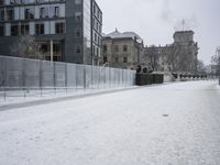 A monochromatic view of a residential neighbourhood in a city, featuring a high-rise condominium, a grey asphalt road and a public space with a street light, tree, fence and tar curb - illuminated in the day's light.