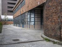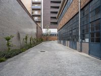 A view of an alley-way in the Hinterhof neighborhood of a European city, showcasing the classic architecture of the buildings, cobble stone flooring, and urban design elements such as the manhole cover, brick wall, and bicycle.