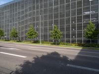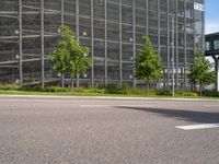 A clear sky overlooks a modern cityscape in Germany, featuring a network of asphalt streets, high-rise buildings, condominiums, and public spaces. A wire fencing and a yellow flag serves as a backdrop to the urban infrastructure, while a parking deck and a tree-lined thoroughfare creates a contrast between nature and modern architecture.