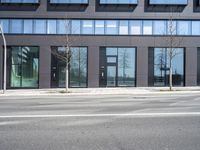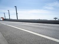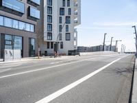 A view of a modern residential area in Hamburg, Germany with a clear sky, grey road surface and urban design elements like a bridge, office building, street light and zebra crossing.