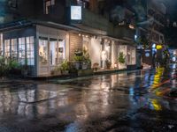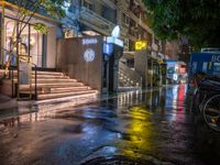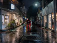 People crossing the wet road at night, illuminated by neon lights and street lights, in Taipei City, Republic of China.