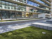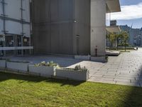 A clear sky day in Lisbon, Portugal reveals the modern architecture of a high-rise office building in the metropolitan area. Symmetrically framed by trees, the urban design includes a paved plaza, grassy open space, and residential condominiums with glass windows, composite material facades, and wood fixtures. The cityscape is illuminated by sunlight and hard shadows, adding a contrast of color and texture to the urban biome.
