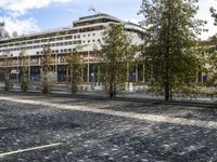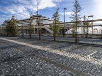 A view of the city of Lisbon, Portugal, with its modern architecture, urban design, public spaces, houses, trees, vegetation, and pier along the coastal waterfront, illuminated by the sunlight of a bright day.