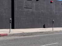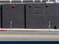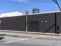 A snapshot of city life in Los Angeles, California, USA. A beige brick wall, black wall, metal wall, and yellow wood house all line the street with a parking lot, chain link fence, and overhead power line in the background. Automotive exteriors, a traffic light, and a storefront window can be seen, along with a mural, advertising banner, and signage of the art district.
