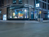 A modern office building in a bustling city neighborhood in Holland, illuminated by street lights and the glow of storefronts, with asphalt roads and curbs, and automotive lighting from passing cars.