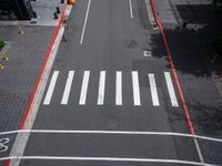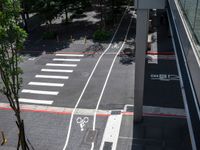 View of the bustling city of Taipei, Taiwan from above, with a motor vehicle driving on the tar and zebra crossing road surface, underpass, bridge, and modern architecture in the background.