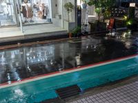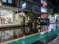 A view of the bustling nightlife in Taipei City, Taiwan, taken from a high position. Artificial light illuminates the urban landscape of the Republic of China, with streetlights, neon signs, and storefronts lit up and reflecting off of the wet asphalt and water below.
