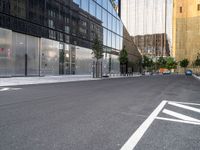 A view of the financial district in Berlin, Germany, showcasing the city's modern architecture, mixed-use buildings, and urban design. Skylines are framed by a clear sky and vegetation, with automobiles and pedestrians on a straight road surface.