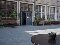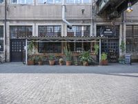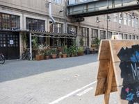 A snapshot of a bustling urban area in Berlin, Germany. A mixed-use area of street art, cafe culture, buildings, and public space with cobble stone roads, trees, shadows, and bicycles, as well as fashionable design, interiors, and furniture.