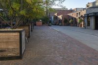 A residential area in the city showcases its infrastructure, with concrete and asphalt surfaces, overhead power lines, street lights, and wood and paver flooring. A clear day brings a light to the trees and the open space, creating a peaceful atmosphere.