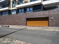 A sunny day overlooking a residential area of Bremen, Germany. This modern composite architecture features a brick wall, grey flooring, wood fixtures, a street light, and a parking lot with a curb and parking spaces. The urban design also includes trees, windows, and entryways to the condos in the neighborhood.