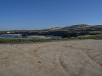 A beautiful natural environment with a lake, mountains, and shoreline near a coastal town in Portugal, with a clear sky above. A combination of asphalt, grass, gravel, and dirt roads, buildings, vegetation, and a horizon of houses, trees, and wood, create a stunning landscape.