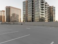 A view of a metropolitan city skyline at dawn, showcasing its high-rise buildings, condominiums, parking decks, parking garages, and other infrastructure in the residential area.