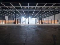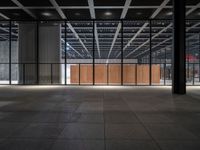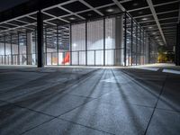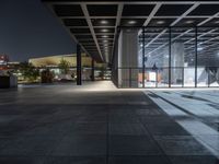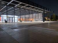 A modern and symmetrical view of the city of Berlin, Germany with a glass wall facade, paved road surface and artificial lights illuminating the urban design in the financial district. Paver flooring and a glass ceiling fixtures reflect the shades of grey while vegetation and a field house provide natural features to the metropolitan area.