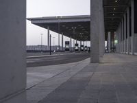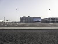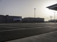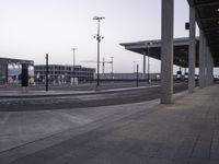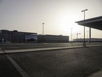A street light illuminates the grey asphalt road surface as the sun rises on a metropolitan area, giving a black and white monochrome look to the landscape. The horizon is dotted with a variety of architecture, from office buildings to a race track and parking lot, with grass, metal fencing, and a walkway adding soft touches to the urban design.