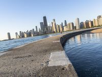 A view of the city of Chicago, Illinois, USA - with its iconic skyline, residential buildings, water resources, and recreational areas, viewed from a bridge over a river on a sunny day.