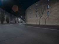 A cityscape at night with a museum building illuminated by artificial light and the city lights shining brightly on the road surface and street lights.