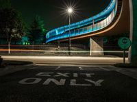 A city street at night in California, USA, illuminated by street lights and the glow of office buildings. The bridge and underpass create a dramatic effect against the clear night sky. The urban design and architecture blend with the vegetation along the road, creating a beautiful scene in the metropolitan area.
