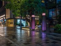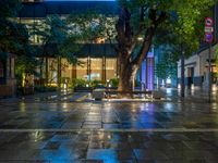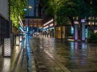 The wet road of Nihonbashi in Tokyo glistens under the artificial light, illuminated storefronts and street lights, together creating a unique urban design in the city after dark.