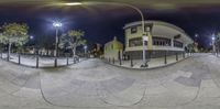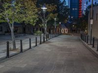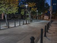 A view of a city street at night with street lights casting a warm glow on the classic architecture, highlighted by the clear sky and artificial lights from buildings and storefronts.