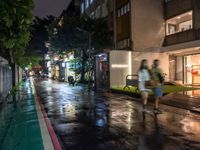 A crosswalk in Taiwan's Taipei City illuminated by neon lights and street lamps, with a wet asphalt road reflecting the artificial light and providing a sense of urban design and life.