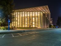 A modern urban design illuminated by artificial light and street lamps can be seen on a dark asphalt road in Los Angeles, California, USA.