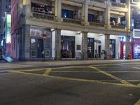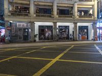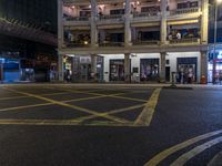A snapshot of mixed-use development in the city of Hong Kong, China, featuring classic architecture, artificial light, public spaces, and a tree-lined road crossing. The night scene reveals silhouettes of people crossing the street and the reflection of the low buildings in the asphalt flooring.