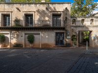an old stone building is next to an entrance and patio with potted plants and bushes
