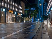 Straight down the road in Nihonbashi, Tokyo, a wet paver glistens under artificial light from the storefronts and street lamps, creating a unique urban design at night.