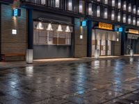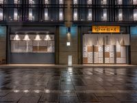 View of the nightlife in Nihonbashi, Tokyo, featuring a wet paver road lined with store fronts and illuminated by artificial light and street lights.