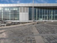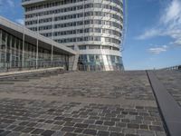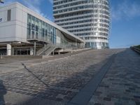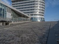 a modern building with a staircase that goes to it's top floor and is standing next to the steps on the cobblestone
