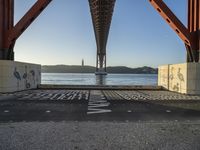 The break of day in Lisbon, Portugal is a sight to behold. The city is alive with color and texture, from the tints and shades of the coastal asphalt to the wooden surface of the pier. The sun, just visible, casts golden light on the lake, pier, and harbor, and the clear sky offers a brilliant backdrop to the graffiti-strewn walls. The composite material and gravel roads of the city blend together to create a unique urban landscape, while trees and grass offer a glimpse of open space.