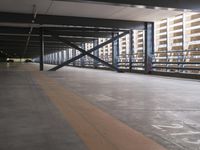 The metropolitan area of Berlin, Germany is illuminated by the light fixtures of a modern office building, with its urban parking lot, asphalt road surface and composite material bridge creating a symmetrical design that stands out against the tints and shades of midnight.