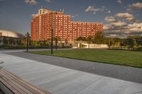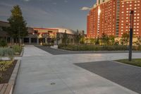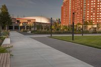 A stunning dawn view of high-rise buildings in Toronto, Canada, with sunlight illuminating the urban landscape and vegetation along the road surface.