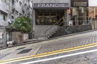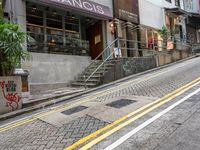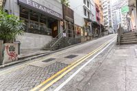 The morning sun casts a yellow hue over the classic architecture and urban design of the metropolitan area of Wan Chai in Hong Kong, China Sar. The bustling city’s mixed-use neighborhoods feature a variety of restaurants, cafes, shops, and residential areas, all connected by the network of roads, lanes, and pedestrian thoroughfares. The facade of a low-rise building with a tree profile is set against a wall of handrails, with partially-asphalt road surfaces and a line of curbs leading the way.