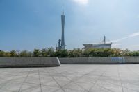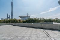 The modern architecture and cityscape of Guangzhou, Guangdong, China is illuminated against a clear sky, with pavers, walls, and open grass surfaces visible in the foreground.