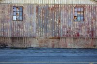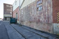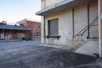 A view of an urban warehouse building in Johnson City, Tennessee, USA. The brick facade and industrial loading dock showcase the city's architecture and real estate. The straight road surface leads to a residential area with houses and apartments lined with blue siding and window profiles.
