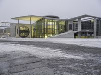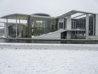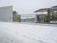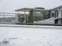 An office building and mixed-use house stand in stark contrast to the surrounding winter vegetation and asphalt road surface in an urban city.