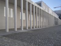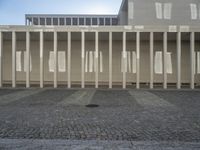 A view of the modern architecture and urban design in Berlin, Germany. The combination of cobble stone, concrete, asphalt, brick, wood, and composite materials create a surface that is a reflection of the city's history and human settlement. The clear sky and symmetrical facade of the office building showcase the city's diversity and urbanity.