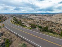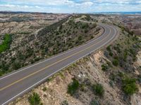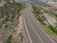 From a high position, an aerial view reveals a straight road cutting through the stunning landscape of Utah, USA. The asphalt road stretches as far as the eye can see, surrounded by vast nature and under a clear blue sky dotted with fluffy white clouds. The elevated perspective offers a unique glimpse into the beauty of this top-down view, showcasing the serenity and grandeur of the Utah landscape. It's a captivating sight that captures the essence of the open road and the wonders of nature.