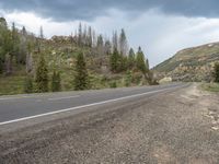 In the heart of Utah's vast landscape, a road winds through the forest, surrounded by majestic mountains. The gloomy grey sky adds a sense of mystery to the scene, while the clouds create a dramatic backdrop. As you drive along the asphalt road, you'll be captivated by the beauty of the nature that surrounds you. The tranquil atmosphere and the one-quarter angle of the road make this a truly unique and memorable experience.