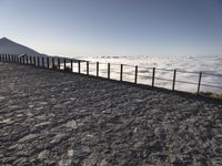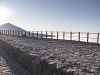 a bench that is on top of a stone area next to the ocean and a large mountain in the distance