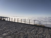 a person standing on top of a mountain looking at the clouds below her railings