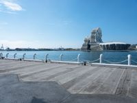 A top down view of Kaohsiung, Taiwan, showing the harbor, a river, a concrete wall, a jetty, and some urban design. The clear sky and dirt surface of the coastal city can be seen from the elevated view.