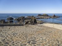 a sidewalk with stepping steps leading to the water on a rocky shore with clear blue sky in background