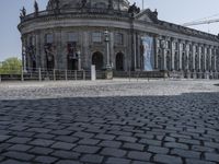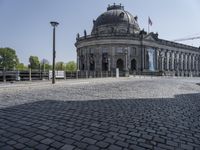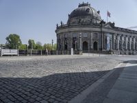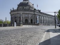 A view of the cobblestone road and plaza from the Bode Museum in Berlin, Germany. The view includes the classic architecture of the Presidential Palace, a monument of urban design, and an iconic dome amongst the clear blue sky.