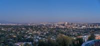 A modern cityscape of Los Angeles, California, USA is illuminated by artificial light in the clear night sky, offering an overview of the city from above.