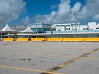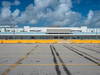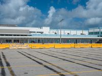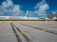 an empty parking lot filled with lots of buildings and trucks in the background of a cloudy blue sky